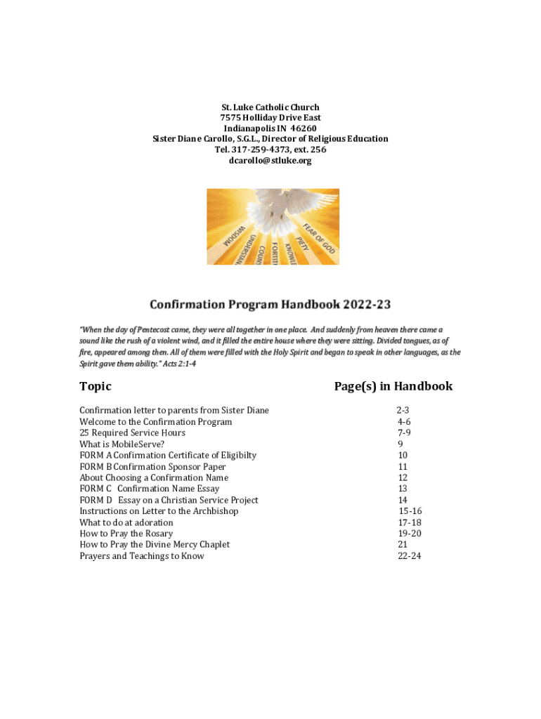 St. Luke Catholic Church7575 Holiday Drive East Indianapolis IN46260Sister Diane Carol lo, S.G.L., Director of Religious Educational. 3172594373, ext. 256dcarollo@stluke.orgWhen the day of Pentecost