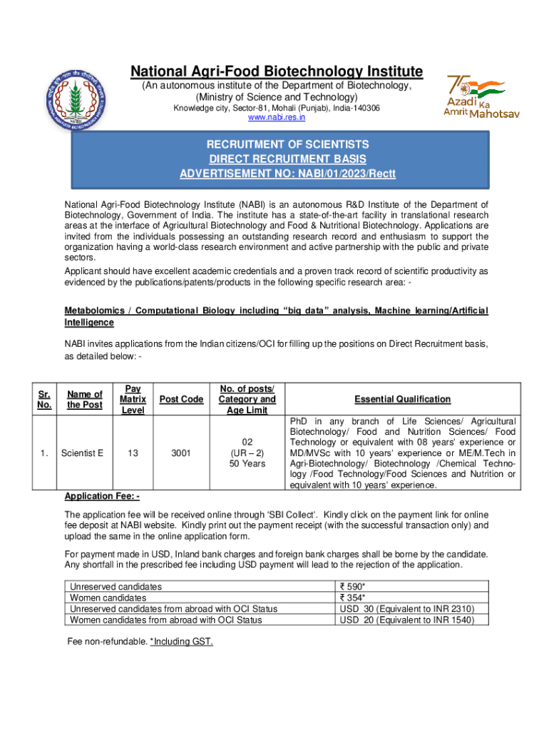 National Agri-food Biotechnology Institute (An autonomous institute of the Department of Biotechnology, (Ministry of Science and Technology) Knowledge city, Sector81, Moral (Punjab), India140306 www.nabi.res.inRECRUITMENT