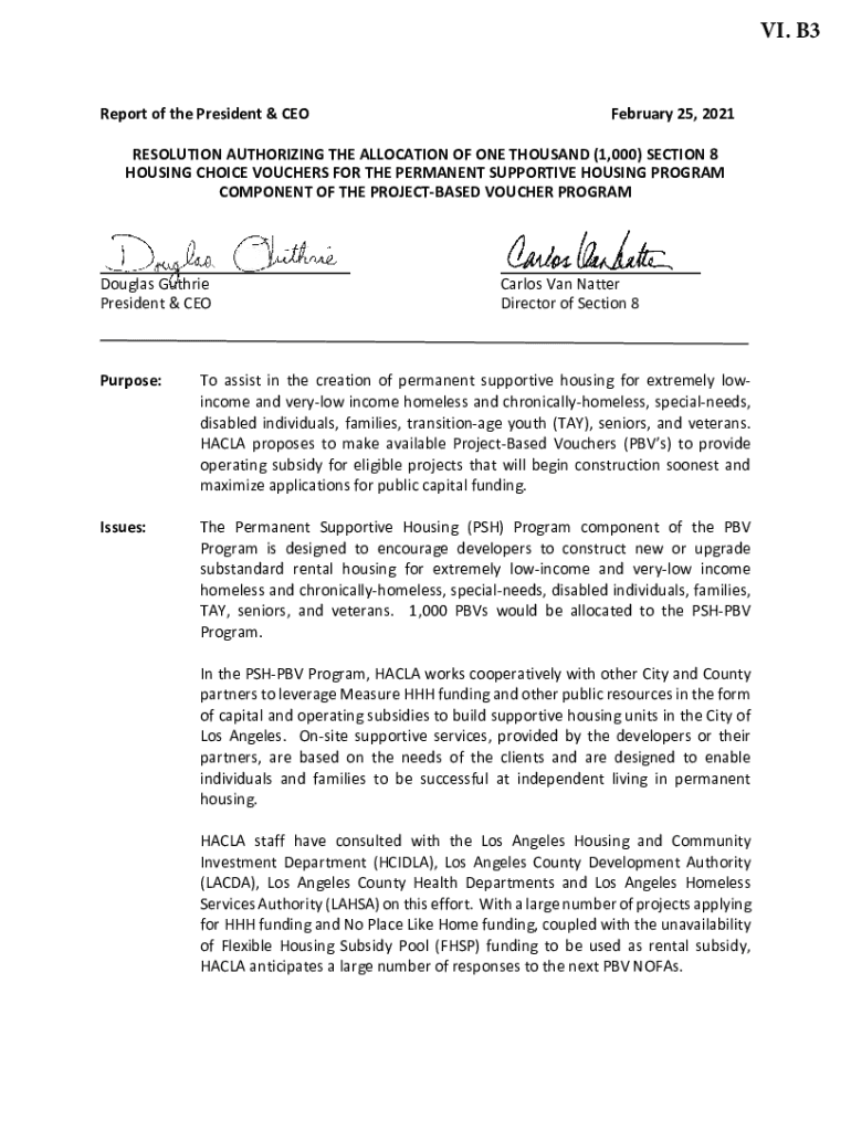 VI. B3Report of the President & CEO February 25, 2021RESOLUTION AUTHORIZING THE ALLOCATION OF ONE THOUSAND (1,000) SECTION 8 HOUSING CHOICE VOUCHERS FOR THE PERMANENT SUPPORTIVE HOUSING PROGRAM COMPONENT