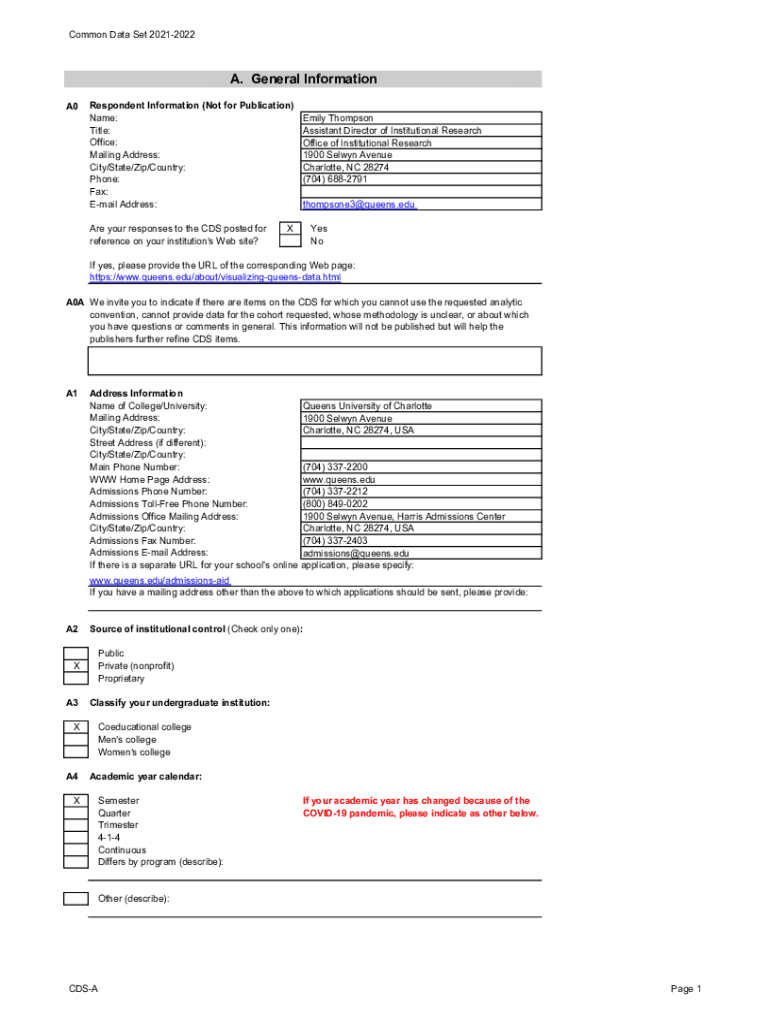 Common Data Set 20212022A. General Information A0Respondent Information (Not for Publication) Name: Title: Office: Mailing Address: City/State/Zip/Country: Phone: Fax: Email Address: Are your responses