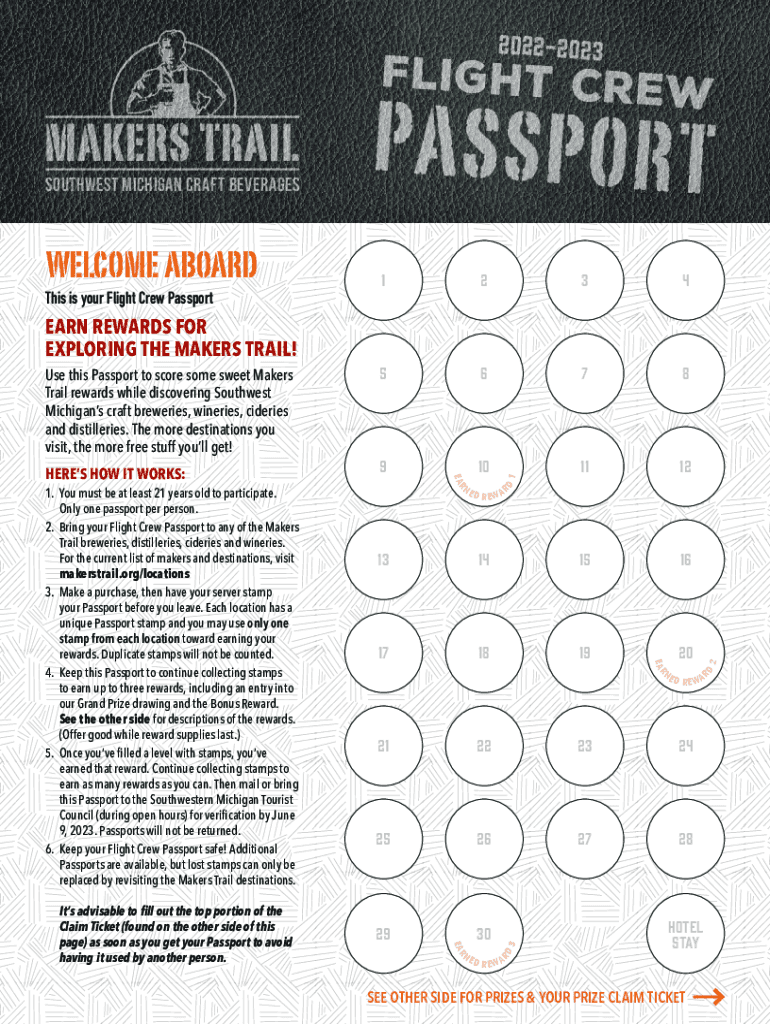 2 0 2 22 0 2 3FLIGHT CREWSOUTHWEST MICHIGAN CRAFT BEVERAGESWELCOME ABOARD This is your Flight Crew PassportPASSPORT 1234567810111216RD15171819NE20RD14D R E WA222324252627282930 321NE2D R E WA13EARIts