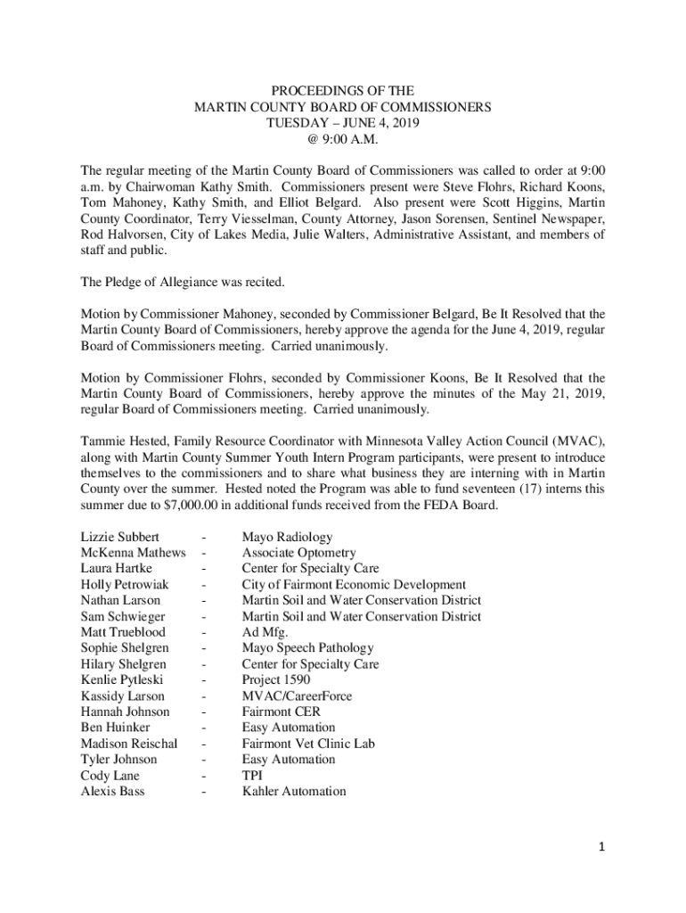 PROCEEDINGS OF THE MARTIN COUNTY BOARD OF COMMISSIONERS TUESDAY, JUNE 4, 2019 @ 9:00 A.M. The regular meeting of the Martin County Board of Commissioners was called to order at 9:00 a.m. by Chairwoman