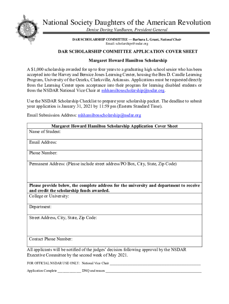 National Society Daughters of the American Revolution Denise During Venture, President General DAR SCHOLARSHIP COMMITTEE Barbara L. Grant, National Chair Email: scholarships@nsdar.orgDAR SCHOLARSHIP