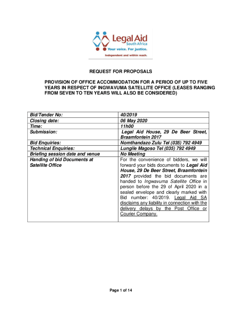 REQUEST FOR PROPOSALS PROVISION OF OFFICE ACCOMMODATION FOR A PERIOD OF UP TO FIVE YEARS IN RESPECT OF INGWAVUMA SATELLITE OFFICE (LEASES RANGING FROM SEVEN TO TEN YEARS WILL ALSO BE CONSIDERED)Bid/Tender