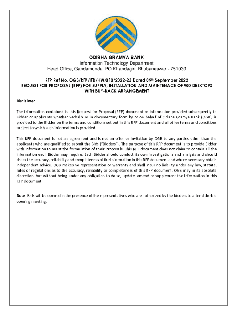 ODISHA GRA MYA BANK Information Technology Department Head Office, Gandamunda, PO Dhaulagiri, Bhubaneswar 751030 RFP Ref No. GB/RFP/IT/HW/010/202223 Dated 09th September 2022 REQUEST FOR PROPOSAL