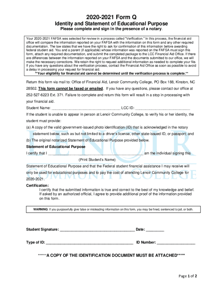 20202021 Form Q Identity and Statement of Educational Purpose Please complete and sign in the presence of a notary. Your 20202021 FAFSA was selected for review in a process called Verification. In
