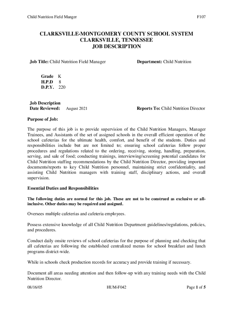 Child Nutrition Field MangerF107CLARKSVILLEMONTGOMERY COUNTY SCHOOL SYSTEM CLARKSVILLE, TENNESSEE JOB DESCRIPTION Job Title: Child Nutrition Field ManagerDepartment: Child NutritionGrade K H.P.D 8