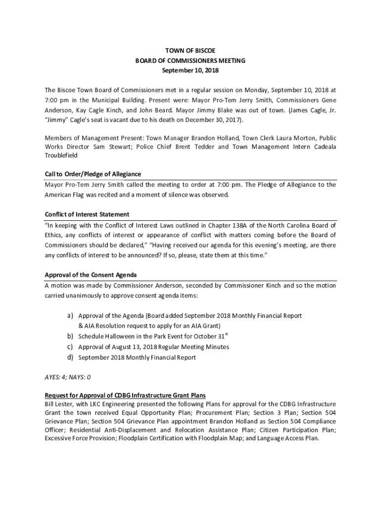 TOWN OF BISCOE BOARD OF COMMISSIONERS MEETING September 10, 2018, The Bishop Town Board of Commissioners met in a regular session on Monday, September 10, 2018, at 7:00 pm in the Municipal Building.