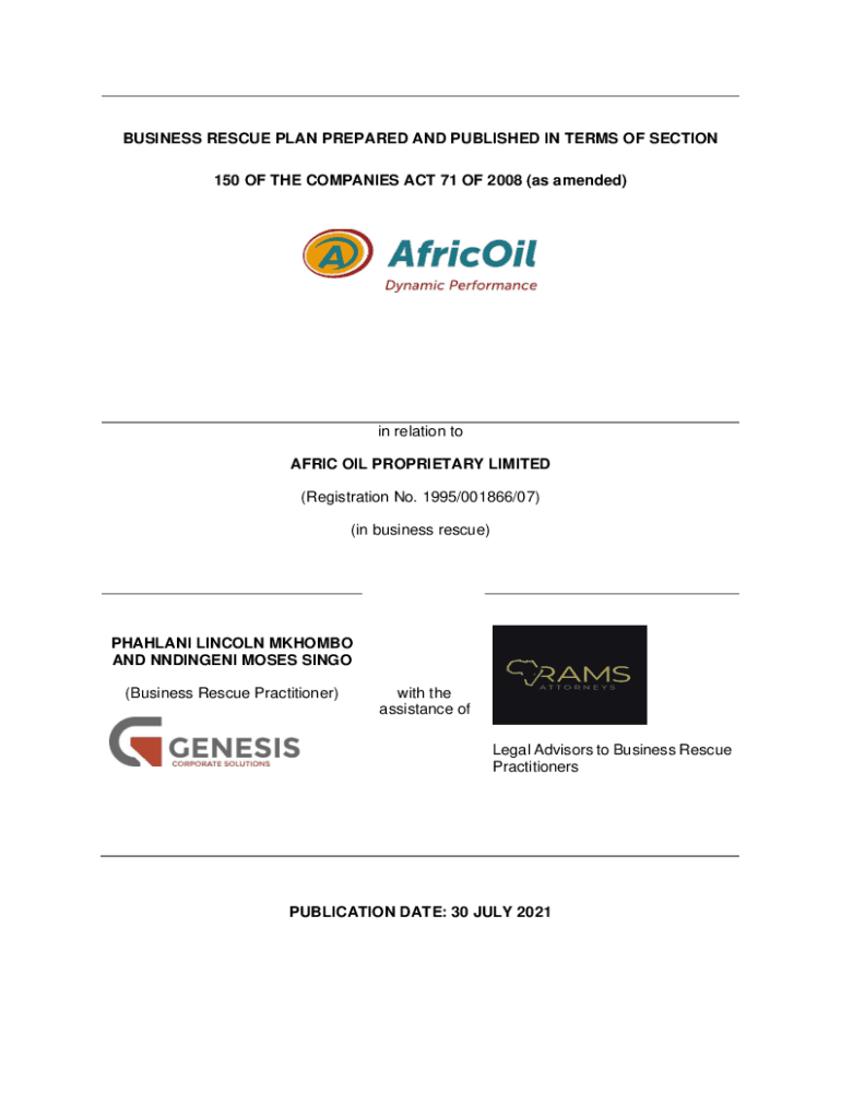BUSINESS RESCUE PLAN PREPARED AND PUBLISHED IN TERMS OF SECTION 150 OF THE COMPANIES ACT 71 OF 2008 (as amended)in relation to AFRICA OIL PROPRIETARY LIMITED (Registration No. 1995/001866/07) (in