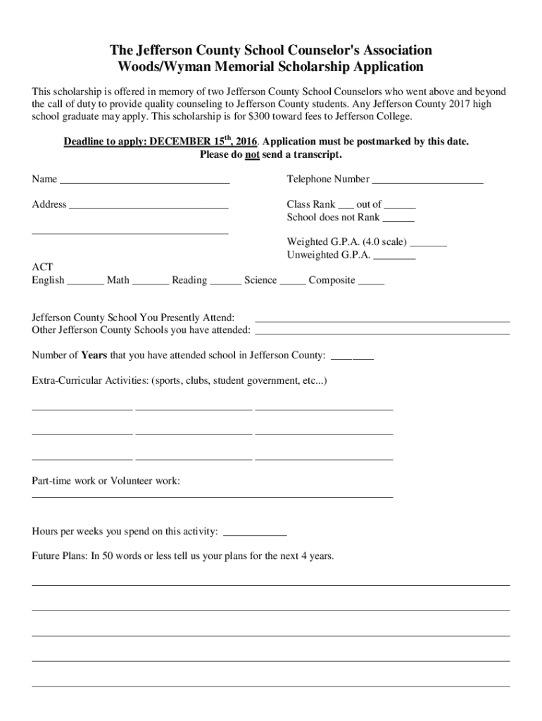 The Jefferson County School Counselor\'s Association Woods/Woman Memorial Scholarship Application This scholarship is offered in memory of two Jefferson County School Counselors who went above and