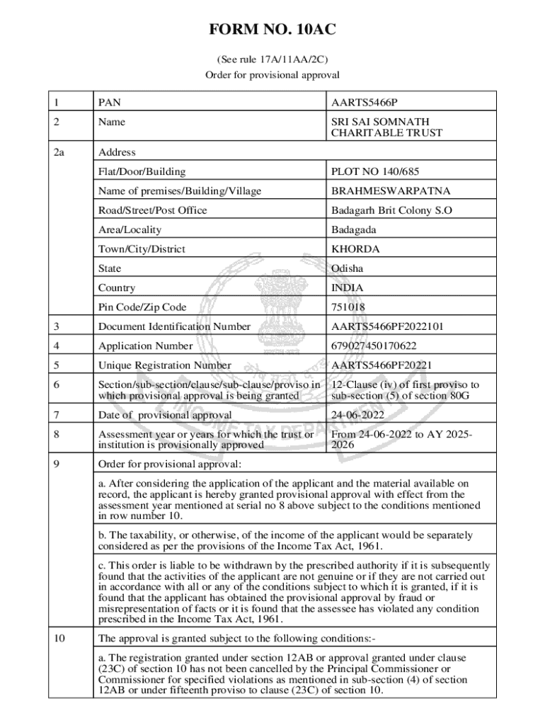 FORM NO. 10AC (See rule 17A/11AA/2C) Order for provisional approval1PANAARTS5466P2NameSRI SAI CHARITABLE TRUST2aAddress Flat/Door/BuildingPLOT NO 140/685Name of premises/Building/VillageBRAHMESWARPATNARoad/Street/Post