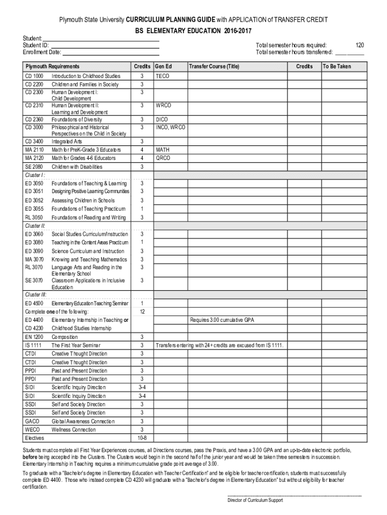 Plymouth State University CURRICULUM PLANNING GUIDE with APPLICATION of TRANSFER CREDIT BS ELEMENTARY EDUCATION 20162017 Student: Student ID: Enrollment Date: Plymouth Requirements CD 1000 CD 2200