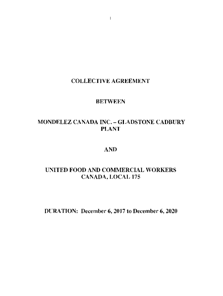 COLLECTIVE AGREEMENTBETWEENMONDELEZ CANADA INC. GLADSTONE CADBURY PLANTANDUNITED FOOD AND COMMERCIAL WORKERS CANADA, LOCAL 175DURATION: December 6, 2017, to December 6, 20202INDEXSUBJECTPAGESUBJECTPAGEA.