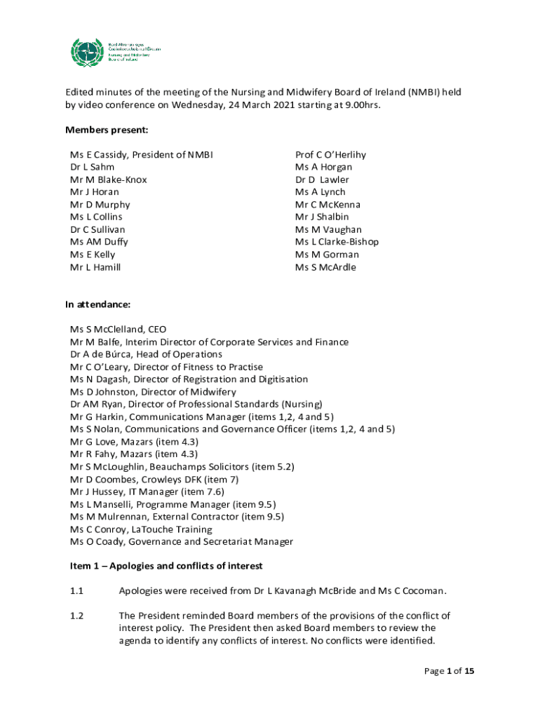 Edited minutes of the meeting of the Nursing and Midwifery Board of Ireland (NIMBI) held by video conference on Wednesday, 24 March 2021 starting at 9.00hrs. Members present: Ms E Cassidy, President