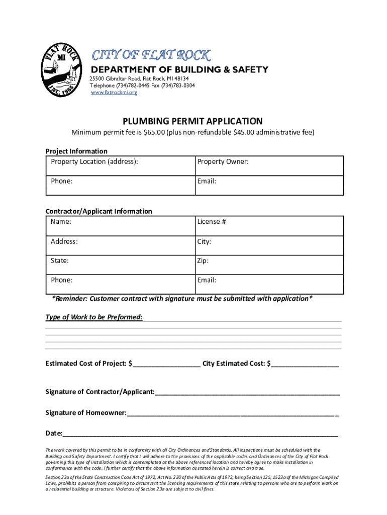 CITY OF FLAT ROCK DEPARTMENT OF BUILDING & SAFETY 25500 Gibraltar Road, Flat Rock, MI 48134 Telephone (734)7820445 Fax (734)7830304 www.flatrockmi.orgPLUMBING PERMIT APPLICATION Minimum permit fee