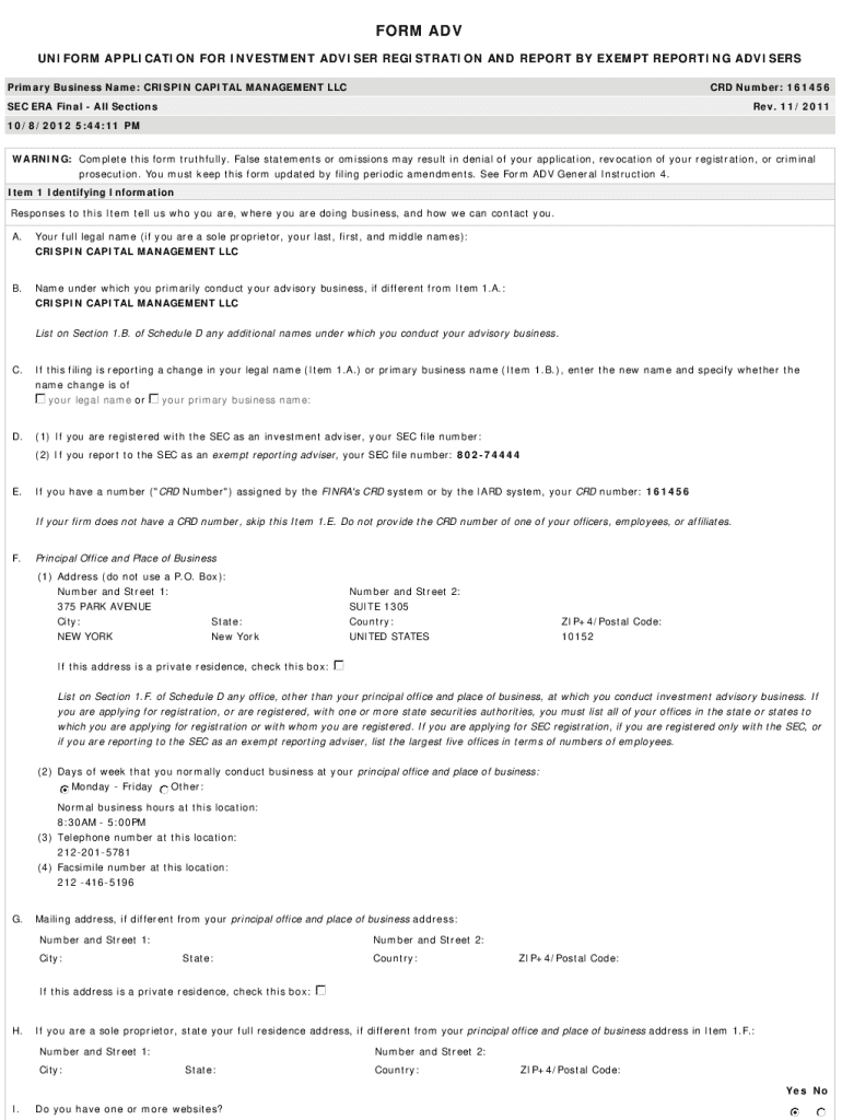 FORM ADV UNIFORM APPLICATION FOR INVESTMENT ADVISER REGISTRATION AND REPORT BY EXEMPT REPORTING ADVISERS Primary Business Name: CRISPIN CAPITAL MANAGEMENT LLC CRD Number: 161456SEC ERA Final All Sections