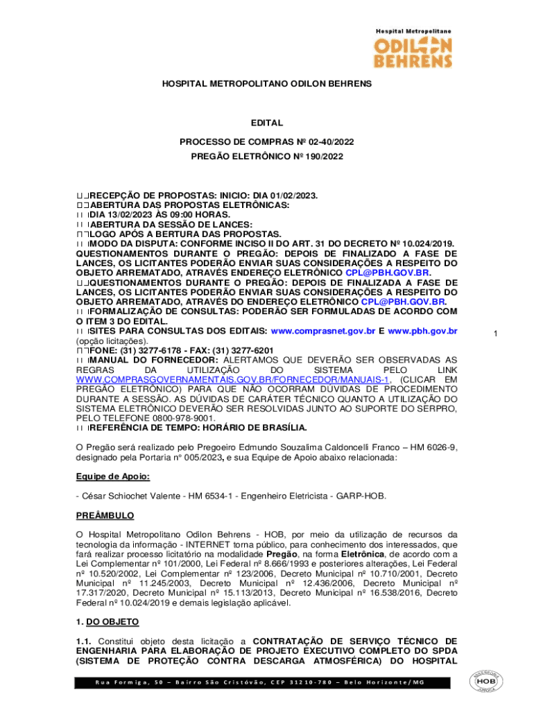 HOSPITAL METROPOLITAN DILLON BEHRENSEDITAL PROCESS ODE COM PRAS N 0240/2022 PRESO ELECTRIC N 190/2022RECEPO DE PROPOSAL: INITIO: DID 01/02/2023. APERTURE WAS PROPOSAL ELECTRICAL: DID 13/02/2023 S