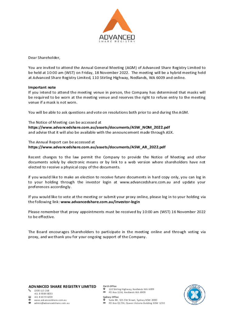 Dear Shareholder, You are invited to attend the Annual General Meeting (AGM) of Advanced Share Registry Limited to be held at 10:00 am (WST) on Friday, 18 November 2022. The meeting will be a hybrid