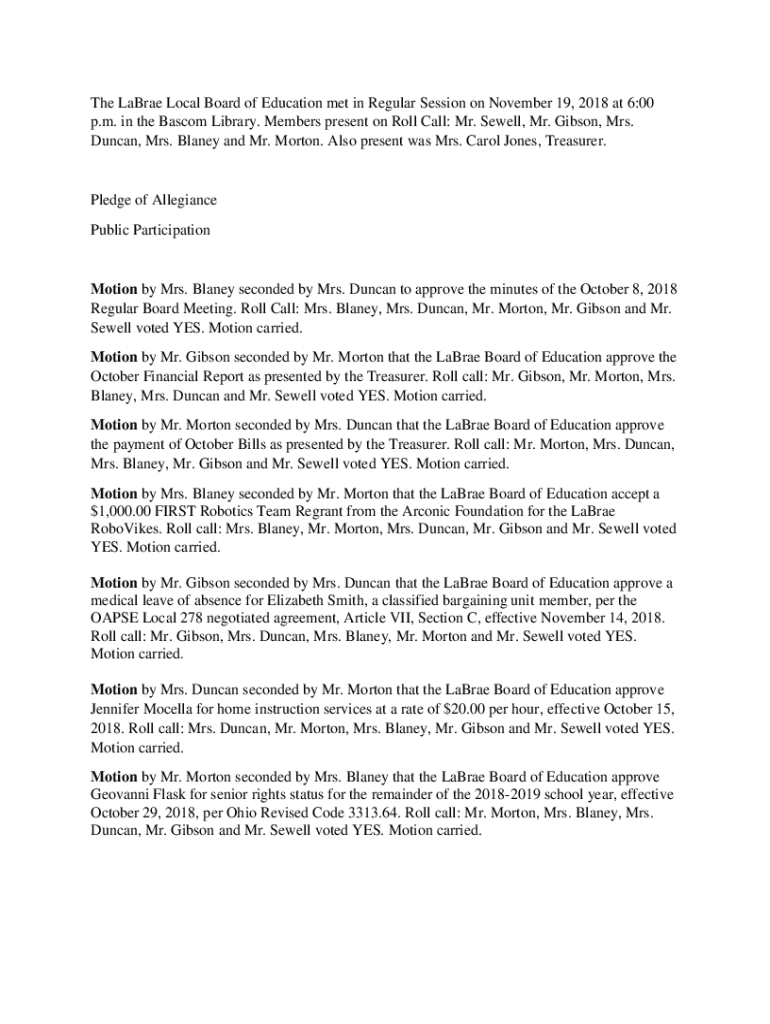 The Labral Local Board of Education met in Regular Session on November 19, 2018, at 6:00 p.m. in the Mascot Library. Members present on Roll Call: Mr. Sewell, Mr. Gibson, Mrs. Duncan, Mrs. Alana and