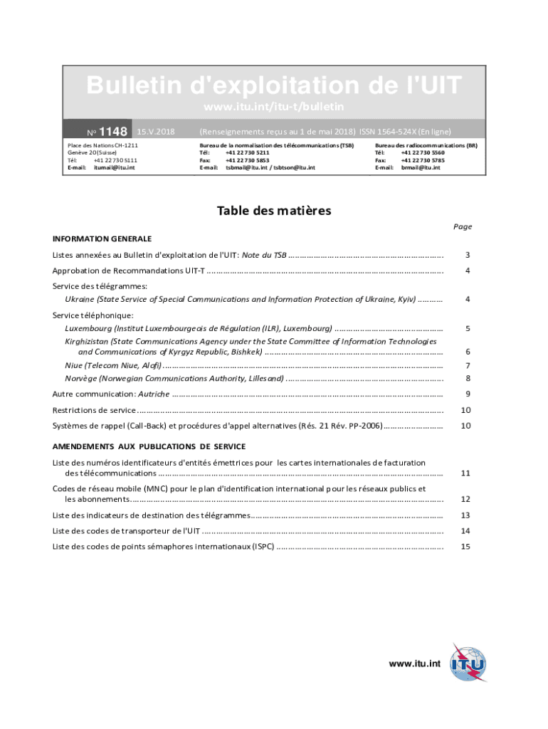 Bulletin d\'exploitation de l\'UIT www.itu.int/itut/bulletin No 114815. V.2018Place DES Nations CH1211 Genre 20 (Swiss) Tl: +41 22 730 5111 Email: itumail@itu.int(Restatements Zeus AU 1 de Mai 2018)