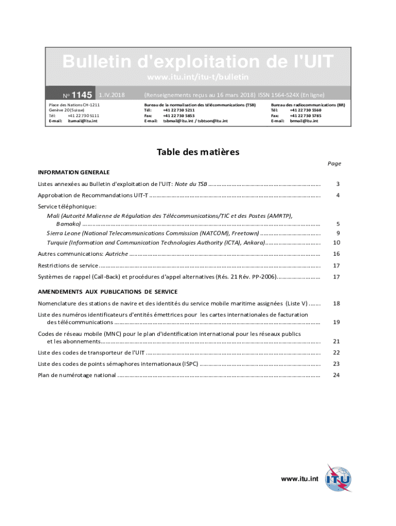 Bulletin d\'exploitation de l\'UIT www.itu.int/itut/bulletin No 11451.IV.2018Place DES Nations CH1211 Genre 20 (Swiss) Tl: +41 22 730 5111 Email: itumail@itu.int(Restatements Zeus AU 16 Mars 2018)