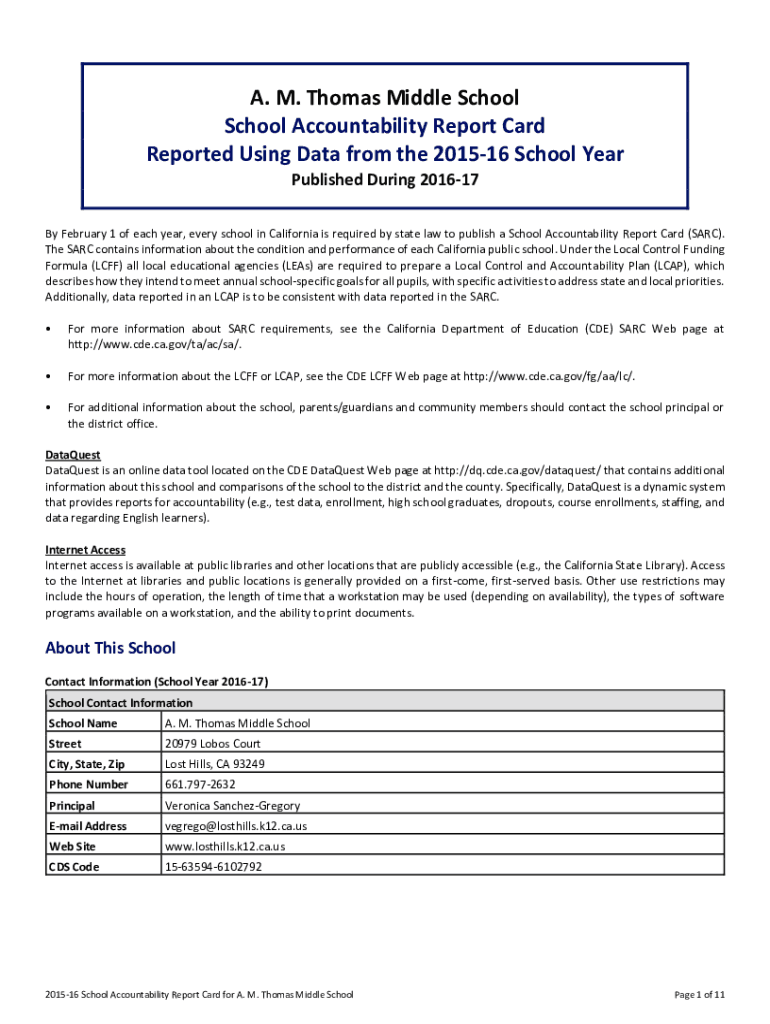 A. M. Thomas Middle School Accountability Report Card Reported Using Data from the 201516 School Year Published During 201617 By February 1 of each year, every school in California is required by