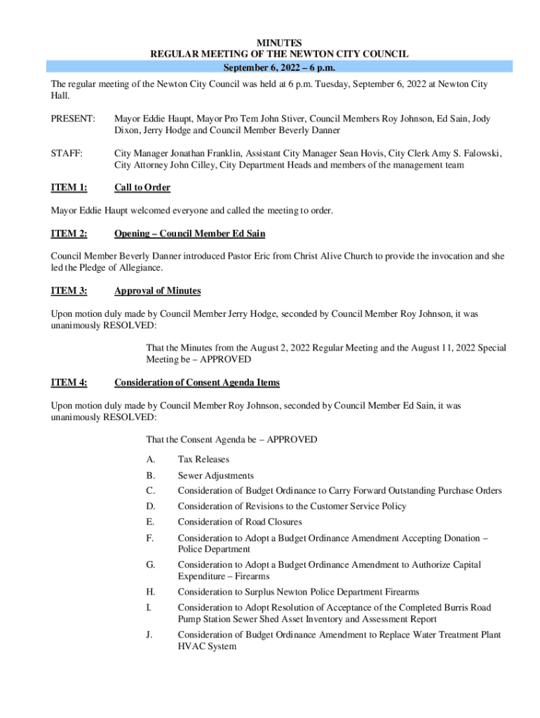 MINUTES REGULAR MEETING OF THE NEWTON CITY COUNCIL September 6, 2022 6 p.m. The regular meeting of the Newton City Council was held at 6 p.m. Tuesday, September 6, 2022, at Newton City Hall. PRESENT:Mayor