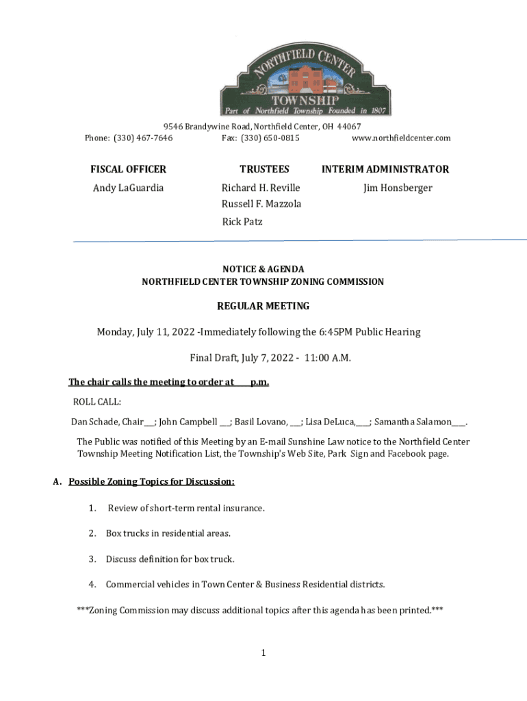 9546 Brandywine Road, Northfield Center, OH 44067 Phone: (330) 4677646 Fax: (330) 6500815 www.northfieldcenter.comFISCAL OFFICERTRUSTEESAndy LaGuardiaRichard H. Seville Russell F. MazzolaINTERIM ADMINISTRATOR