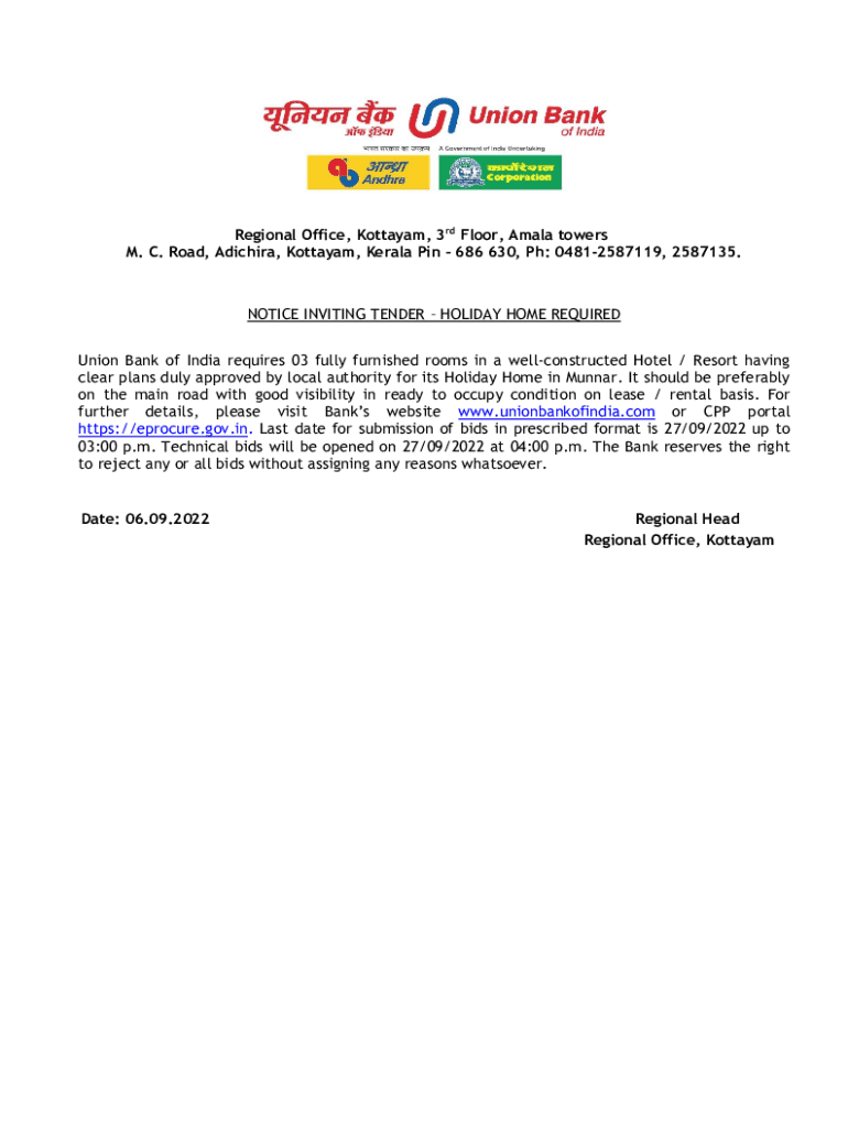 Regional Office, Ottawa, 3rd Floor, Amalia towers M. C. Road, Adichie, Ottawa, Kerala Pin 686 630, pH: 04812587119, 2587135.NOTICE INVITING TENDER HOLIDAY HOME REQUIRED Union Bank of India requires
