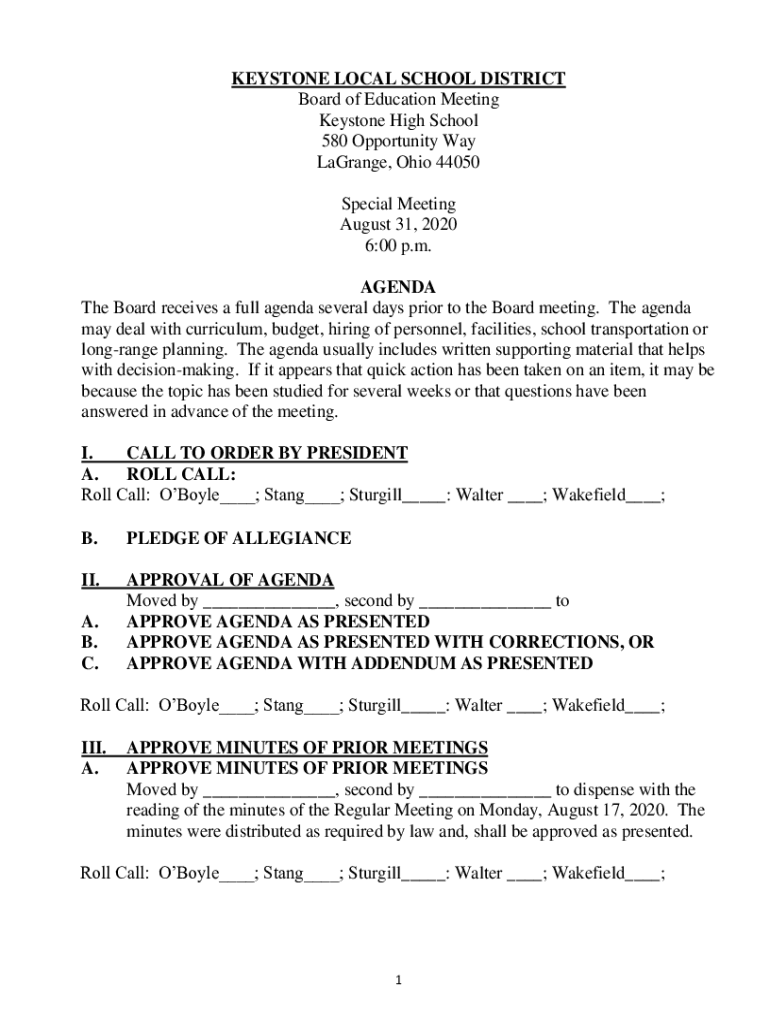 KEYSTONE LOCAL SCHOOL DISTRICT Board of Education Meeting Keystone High School 580 Opportunity Way LaGrange, Ohio 44050 Special Meeting August 31, 2020 6:00 p.m. AGENDA The Board receives a full agenda
