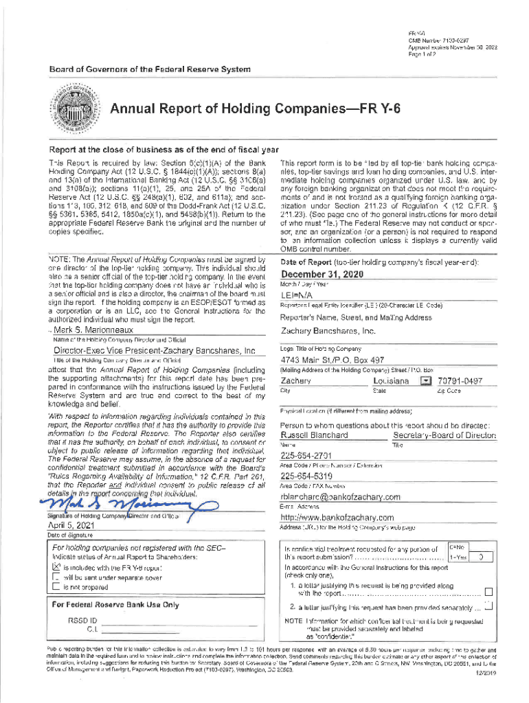 FR Y6 0 MB Number 71000297 Approval expires November 30, 2022-Page 1 of 2Board of Governors of the Federal Reserve System. ... i, .IOI:. ....;...f:. Annual Report of Holding Companies FR Y6.:. 11....,