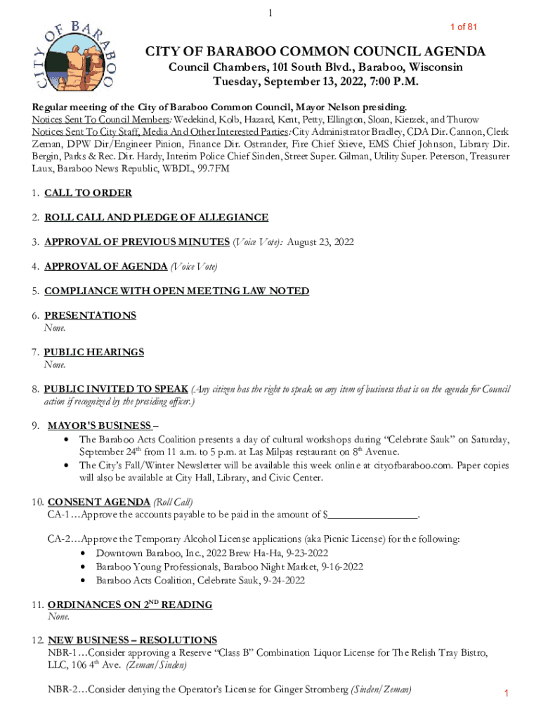 1 1 of 81CITY OF BAMBOO COMMON COUNCIL AGENDA Council Chambers, 101 South Blvd., Bamboo, Wisconsin Tuesday, September 13, 2022, 7:00 P.M. Regular meeting of the City of Bamboo Common Council, Mayor