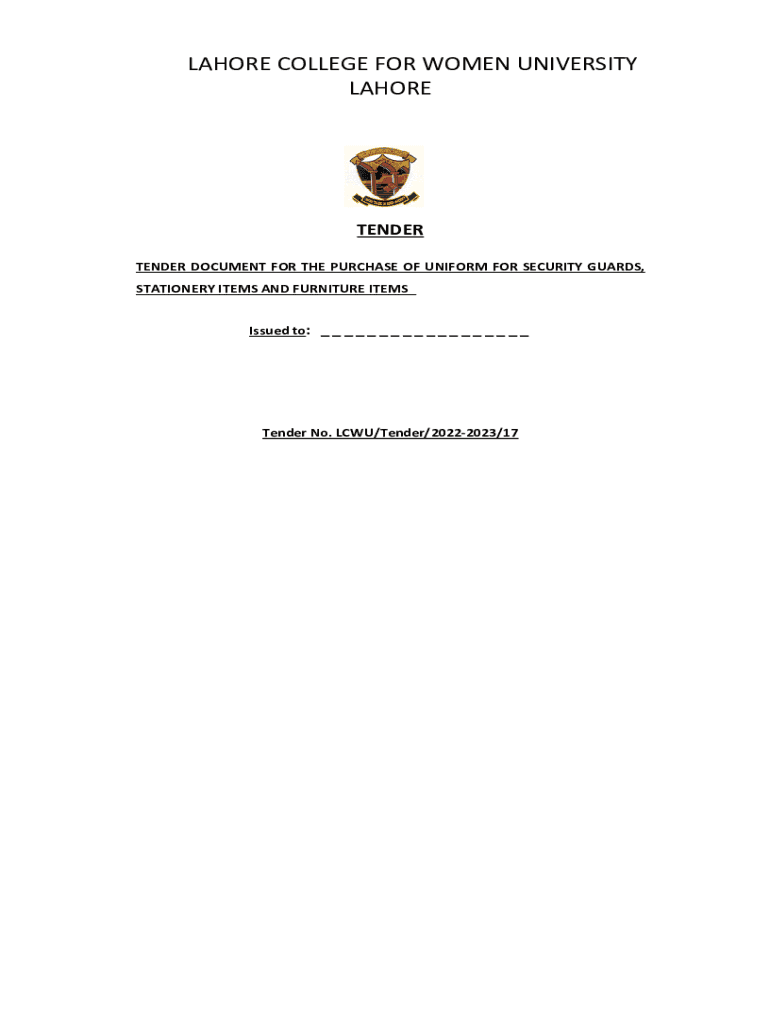LAHORE COLLEGE FOR WOMEN UNIVERSITY LAHORETENDER TENDER DOCUMENT FOR THE PURCHASE OF UNIFORM FOR SECURITY GUARDS, STATIONERY ITEMS AND FURNITURE ITEMS Issued to: _ _ _ _ _ _ _ _ _ _ _ _ _ _ _ _ _