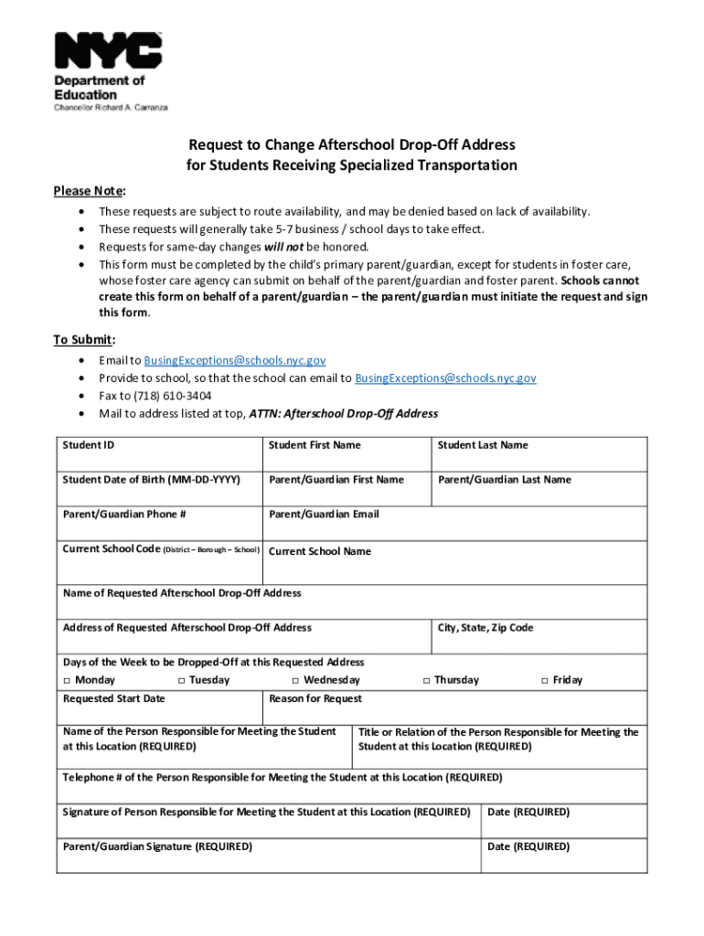 Request to Change After school Drop-off Address for Students Receiving Specialized Transportation Please Note: These requests are subject to route availability, and may be denied based on lack of