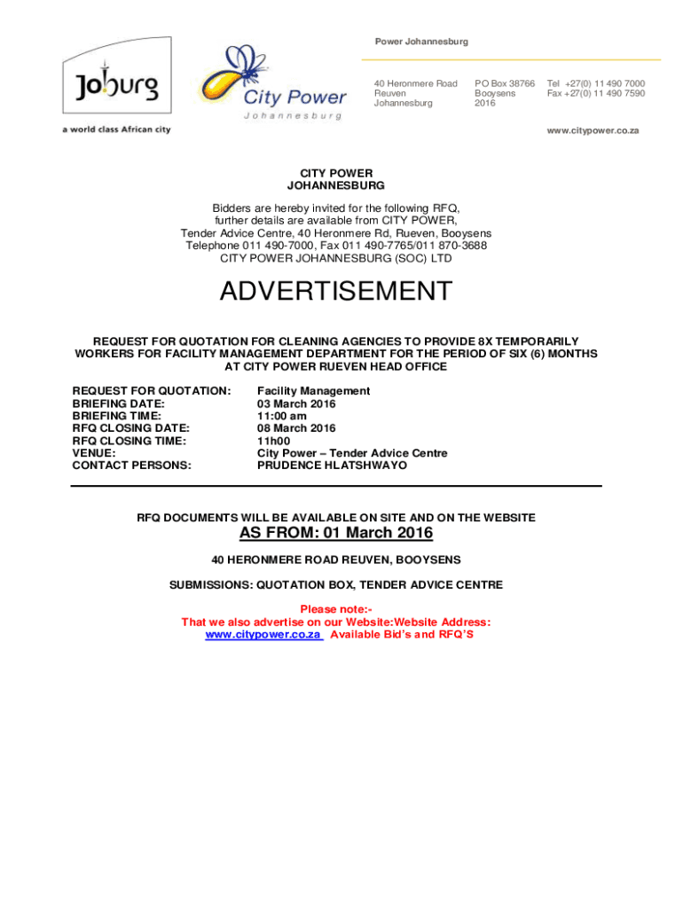 Power Johannesburg40 Heron mere Road Reuben Johannesburg PO Box 38766 Loosens 2016Tel +27(0) 11 490 7000 Fax +27(0) 11 490 7590www. City power.co.city POWER JOHANNESBURG Bidders are hereby invited