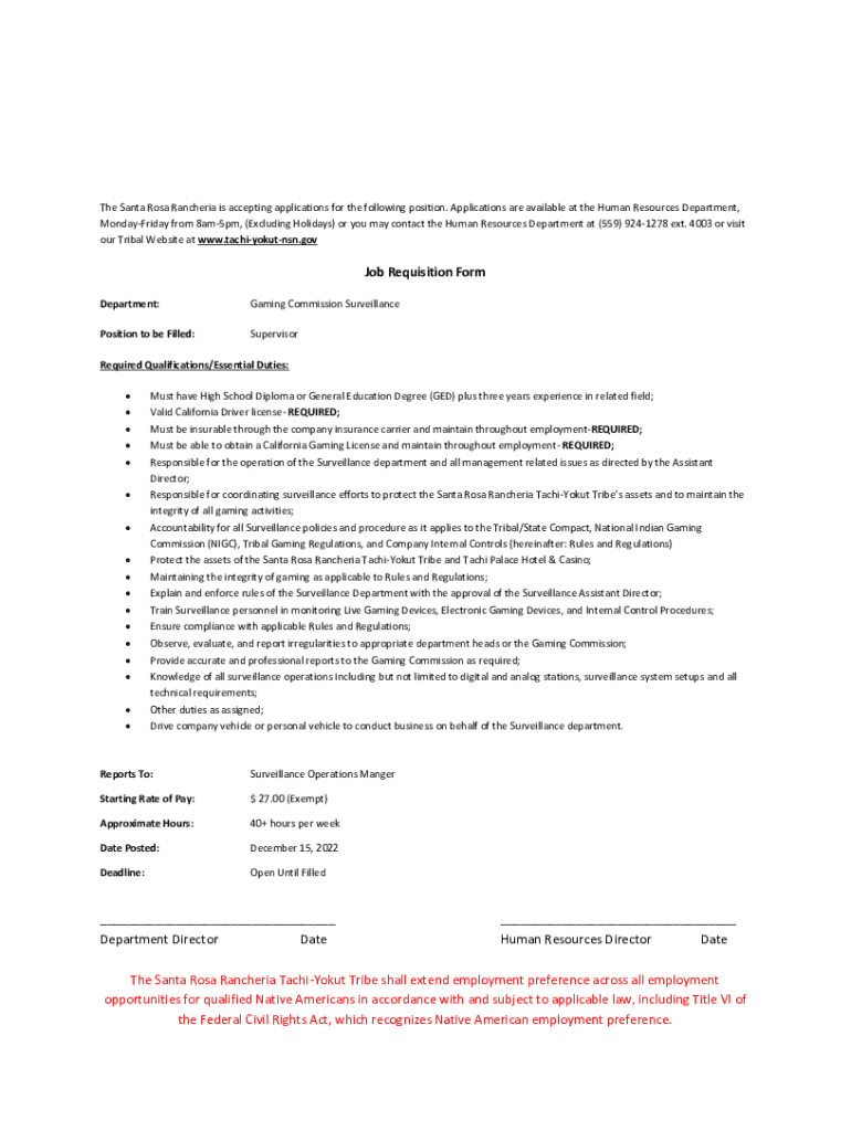 The Santa Rosa Ranchers is accepting applications for the following position. Applications are available at the Human Resources Department, Monday Friday from 8am5pm, (Excluding Holidays) or you may