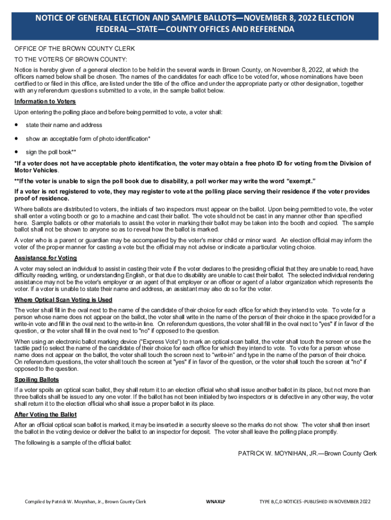 NOTICE OF GENERAL ELECTION AND SAMPLE BALLOTSNOVEMBER 8, 2022 ELECTION FEDERALSTATECOUNTY OFFICES AND REFERENCE OFFICE OF THE BROWN COUNTY CLERK TO THE VOTERS OF BROWN COUNTY: Notice is hereby given
