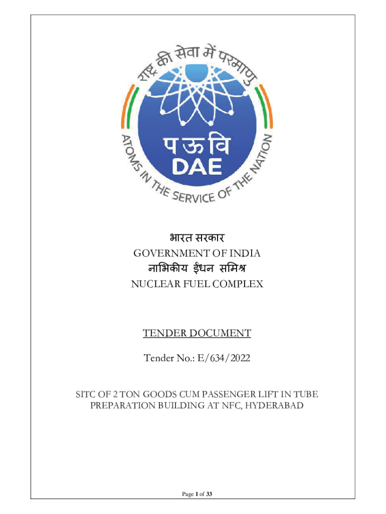 GOVERNMENT OF INDIA NUCLEAR FUEL COMPLEXTENDER DOCUMENT Tender No.: E/634/2022 SITE OF 2 TON GOODS Come PASSENGER LIFT IN TUBE PREPARATION BUILDING AT NFC, HYDERABADPage 1 of 33GOVERNMENT OF INDIA
