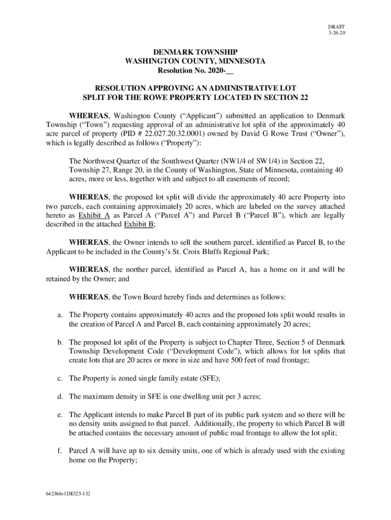 DRAFT 32620DENMARK TOWNSHIP WASHINGTON COUNTY, MINNESOTA Resolution No. 2020__ RESOLUTION APPROVING AN ADMINISTRATIVE LOT SPLIT FOR THE ROWE PROPERTY LOCATED IN SECTION 22 WHEREAS, Washington County