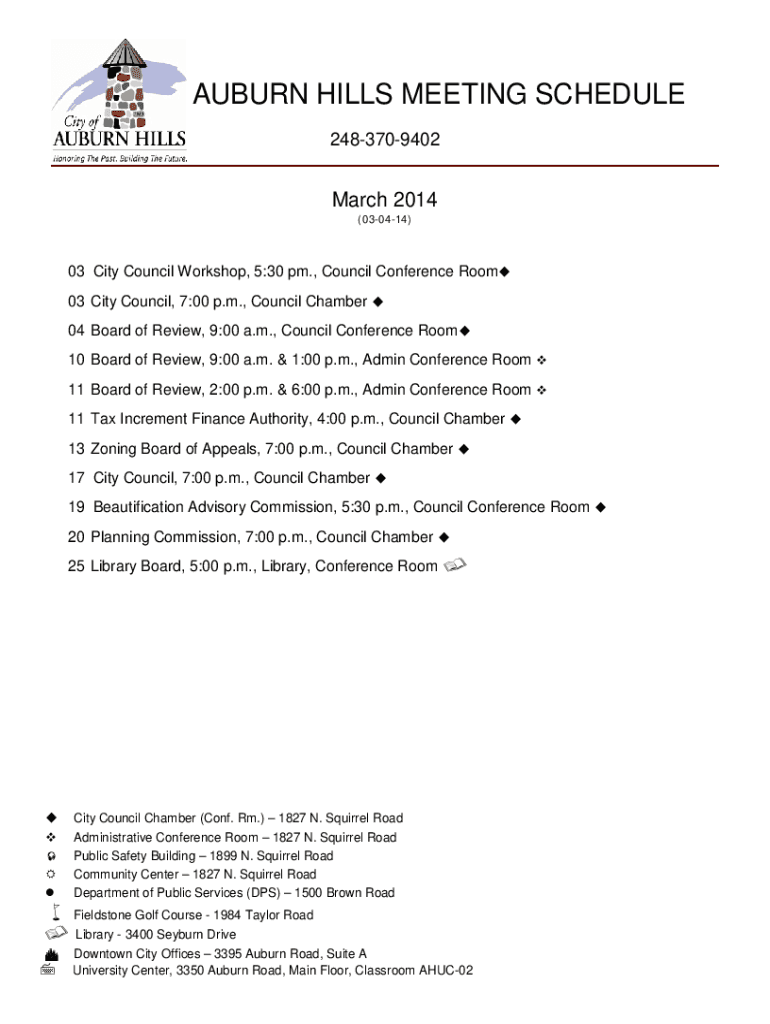 AUBURN HILLS MEETING SCHEDULE 2483709402March 2014 (030414)03 City Council Workshop, 5:30 pm., Council Conference Room 03 City Council, 7:00 p.m., Council Chamber 04 Board of Review, 9:00 a.m., Council