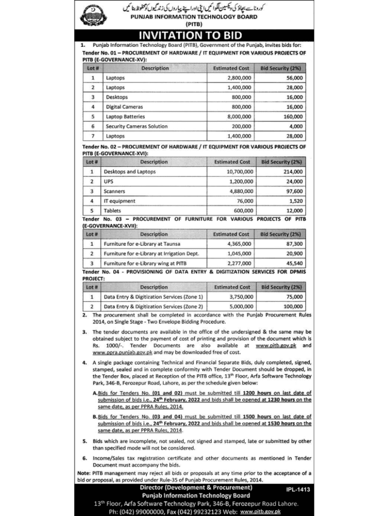 Tender Document Tender No. 3100220221PROVISIONING OF DATA ENTRY & DIGITIZATION SERVICES FOR DPMI PROJECT Punjab Information Technology Board (PIT) 13th Floor, Area Software Technology Park (ASAP),