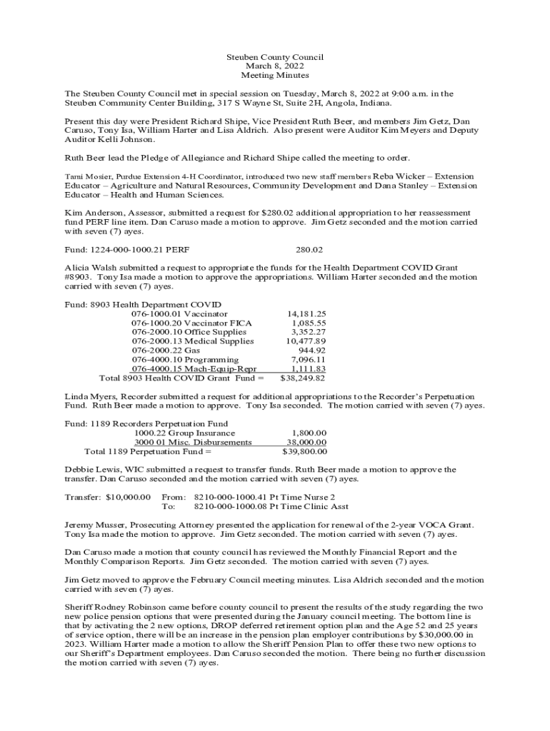 Steuben County Council March 8, 2022, Meeting Minutes The Steuben County Council met in special session on Tuesday, March 8, 2022, at 9:00 a.m. in the Steuben Community Center Building, 317 S Wayne