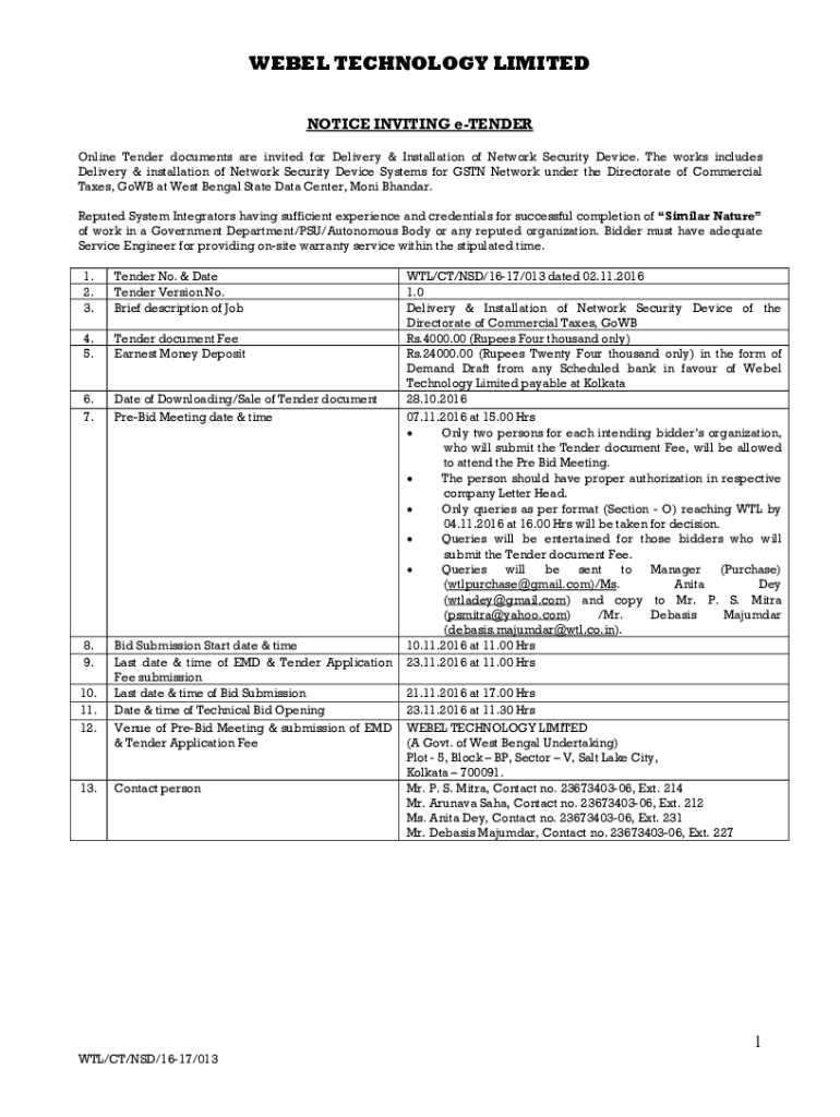 REBEL TECHNOLOGY LIMITED NOTICE INVITING tender Online Tender documents are invited for Delivery & Installation of Network Security Device. The works include Delivery & installation of Network Security