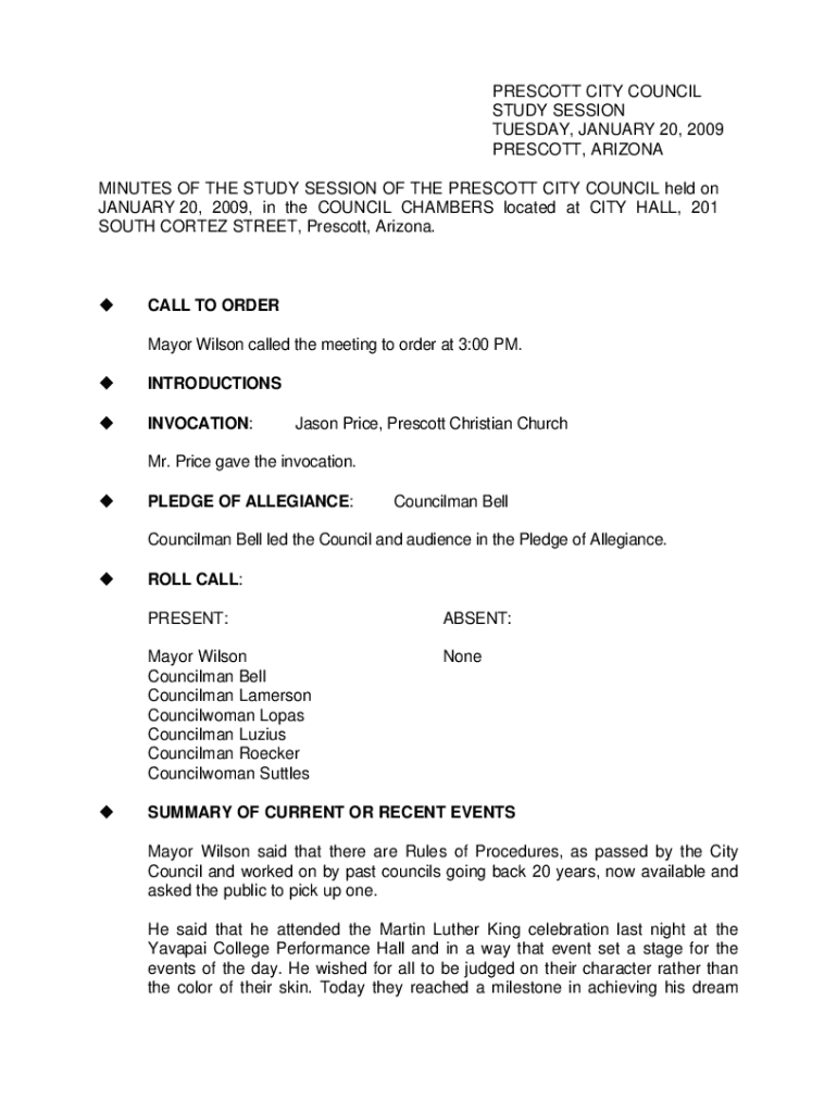 PRESCOTT CITY COUNCIL STUDY SESSION TUESDAY, JANUARY 20, 2009, PRESCOTT, ARIZONA MINUTES OF THE STUDY SESSION OF THE PRESCOTT CITY COUNCIL held on JANUARY 20, 2009, in the COUNCIL CHAMBERS located