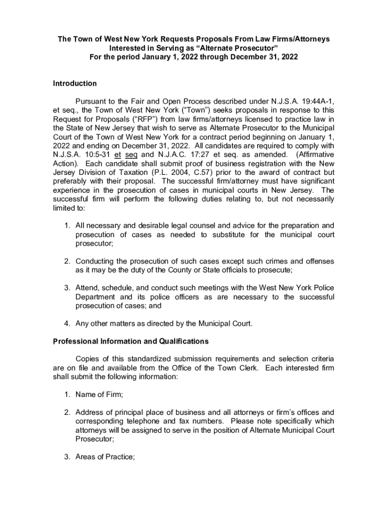 The Town of West New York Requests Proposals From Law Firms/Attorneys Interested in Serving as Alternate Prosecutor For the period January 1, 2022, through December 31, 2022, Introduction Pursuant