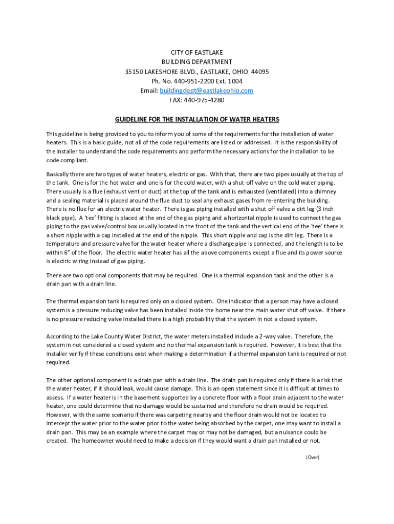 Get the free guideline for instal of water heaters - City of Eastlake Ohio