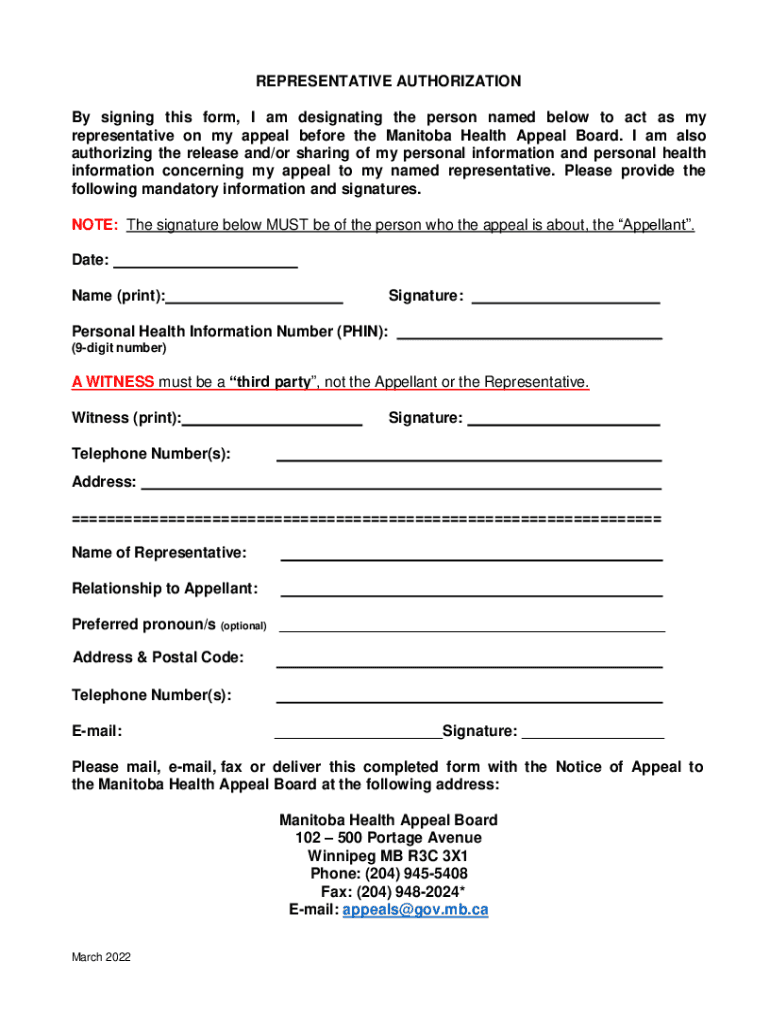 REPRESENTATIVE AUTHORIZATION By signing this form, I am designating the person named below to act as my representative on my appeal before the Manitoba Health Appeal Board. I am also authorizing the