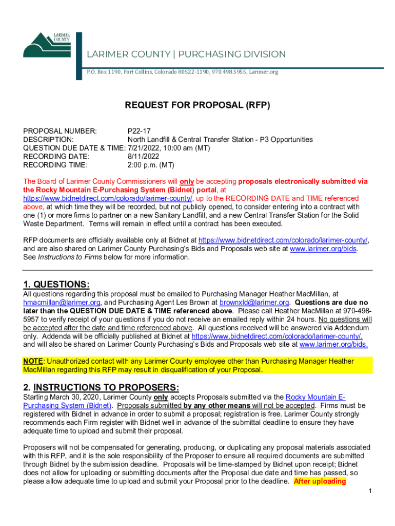 LARIMER COUNTY | PURCHASING DIVISION P.O. Box 1190, Fort Collins, Colorado 805221190, 970.498.5955, Latimer. Request FOR PROPOSAL (RFP) PROPOSAL NUMBER: P2217 DESCRIPTION: North Landfill & Central