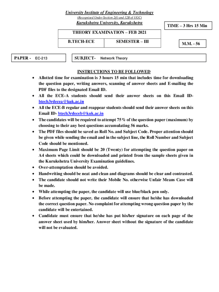University Institute of Engineering & Technology (Recognized Under Section 2(f) and 12B of UGC)Kurukshetra University, KurukshetraTIME 3 Hrs 15 Theory EXAMINATION FEB 2021 B.TECHECEPAPER EC213 SUBJECTSEMESTER