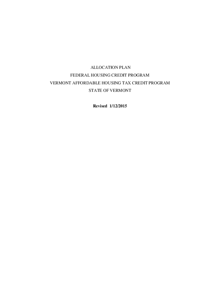ALLOCATION PLAN FEDERAL HOUSING CREDIT PROGRAM VERMONT AFFORDABLE HOUSING TAX CREDIT PROGRAM STATE OF VERMONTRevised 1/12/2015Joint Committee on Tax Credits Jennifer Dollar Deputy Commissioner Department